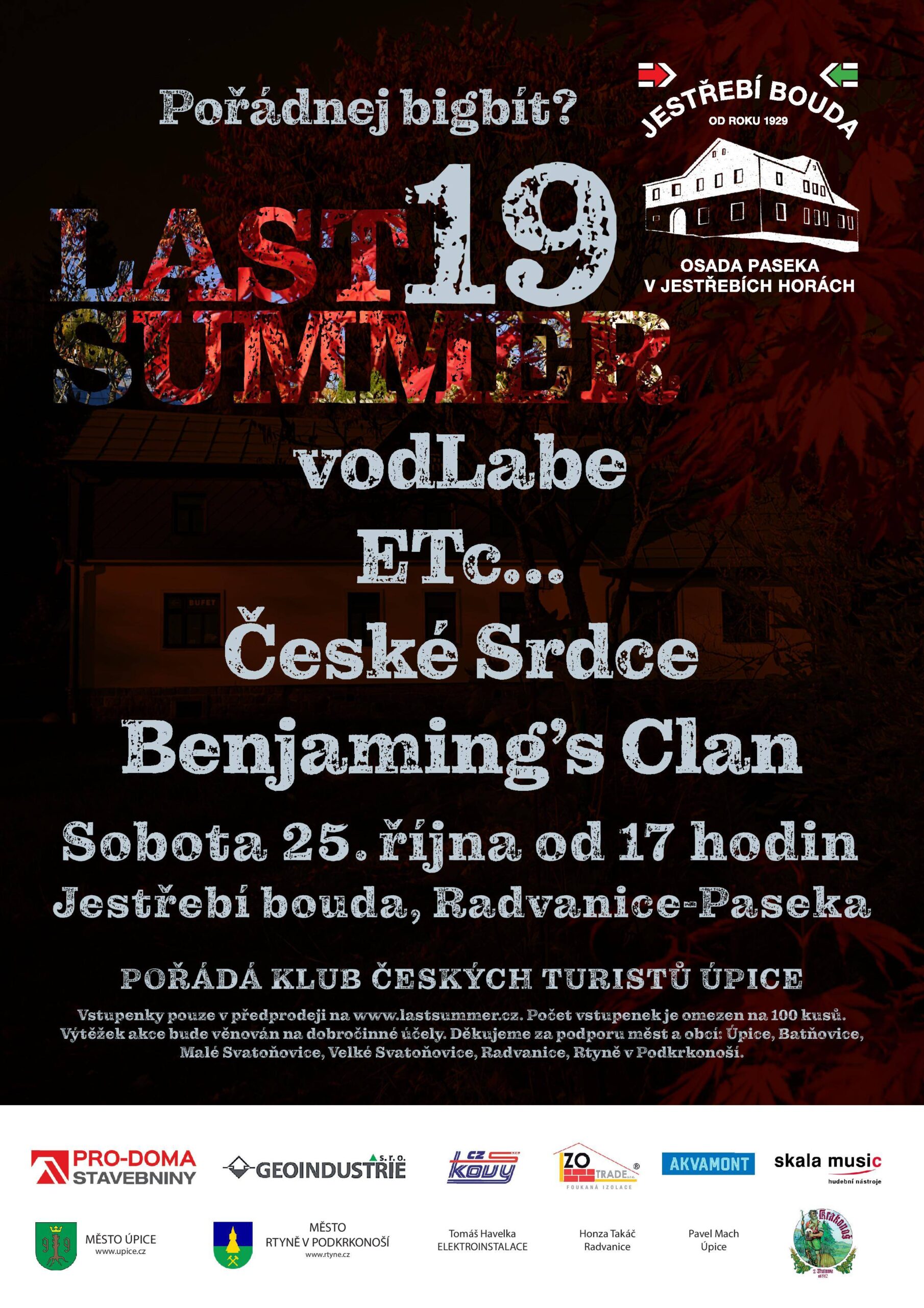 V sobotu 25. 10. 2025 se na Jestřebí boudě — Řehačce — opět uskutečnil bigbítový minifestival Last Summer. Letos již po devatenácté. Na pódiu se v průběhu večera postupně vystřídaly čtyři kapely. Celou akci zahájila skupina vodLabe ze Dvora Králové, která roztančila publikum svými bigbítovými tóny. Následně vystoupilo České Srdce — se změnou kapely došlo i ke změně žánru — Řehačkou se rozezněl energický rock, ve kterém se mísily prvky folklóru a české tradice. Po nich si pódium převzala legendární kapela ETc… Závěr hudebního večera patřil skupině z Petříkovic, která na Last Summeru hrála již podruhé: Benjaming’s Clan. Jejich neotřelý styl Rock ‚n‘ dudy vyzval k tanci drtivou většinu posluchačů. Srdečně děkujeme publiku, sponzorům-kamarádům — bez kterých se kultura dělat nedá. Velké díky patří i kapelám, zvukařům, dále všem, kteří pomáhali s organizací, občerstvením a svědomitě se starali o hladký průběh celé akce. A nakonec Léně za (jako vždy) krásné fotky. Text: Kateřina Nývltová